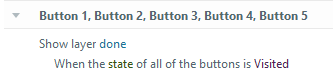 Once all pieces of the accordion interaction were visited, I wanted a button to appear that would send the user to a concluding screen. To do this, I added five invisible buttons to the scene that correspond to the five layers in my accordion interaction. In each layer, I created a trigger that changed the status of the corresponding button to ‘Visited’ when the timeline started on that layer. Then, once all the buttons had been changed to ‘Visited’, the Got it! button layer (done) appeared.